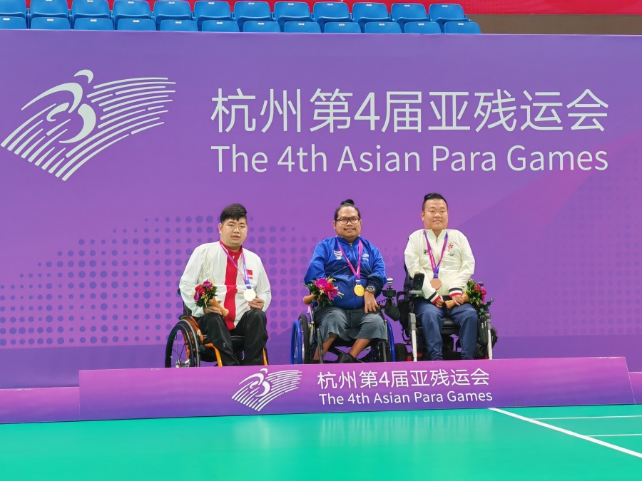 郑远森(左一)获硬地滚球BC4级男子单打银牌