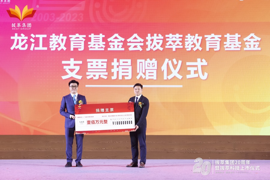 活动中,拔萃集团董事长杨冉还代表拔萃集团,向龙江镇副镇长吴俊移交100万元现金支票,用以捐赠龙江教育基金会,设立“拔萃教育基金”,全方位助力顺德地区教育事业高质量发展。