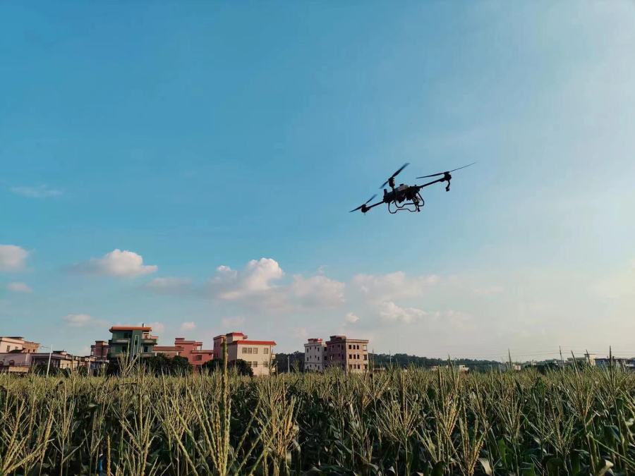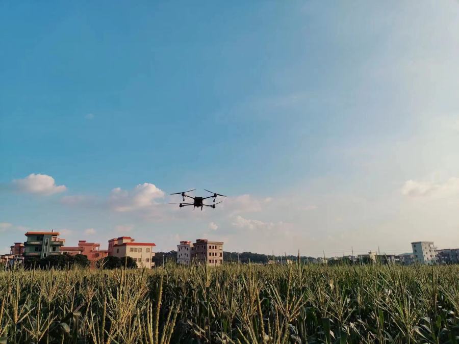 两架农用无人机在飞手的操纵下,启动、升空、飞翔、盘旋、空中停顿、掉头、洒药......一连串的动作连贯自如,令人眼花缭乱。田间的甜玉米长势喜人,果实饱满,丰收在望。这是日前在广州市花都区花山镇儒林村甜玉米病虫害专业化统防统治示范观摩现场会的一幕。