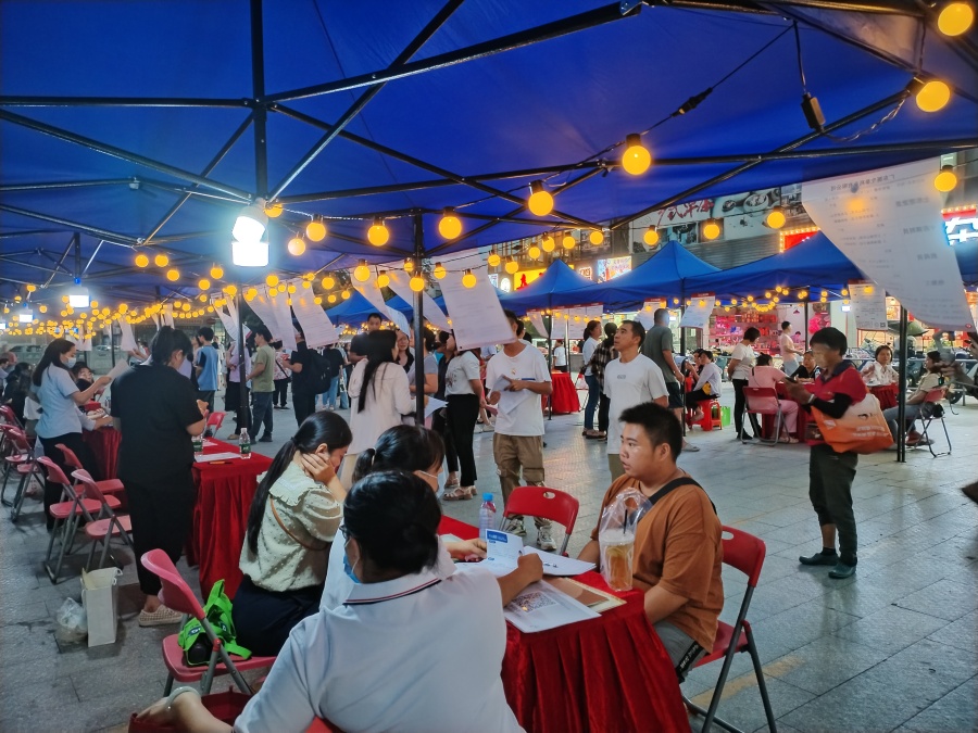 当天晚上7时30分,位于江村广场的夜市招聘会热闹非凡。记者在现场看到几十个招聘企业,提供了300余个岗位,覆盖制造、会计、技术、餐饮等多类型、多行业、多层次的岗位选择,许多求职者穿着正式的套装,手持简历,在现场寻找心仪岗位。