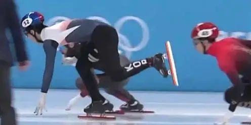 半决赛比赛最后一个弯道,韩国选手黄大宪和加拿大选手杜博伊斯发生冲撞。随后,黄大宪冰刀后摆,而在他们身后紧追的正是武大靖。最后出弯道的冲线时刻,武大靖被哈萨克斯坦选手反超,遗憾无缘A组决赛。