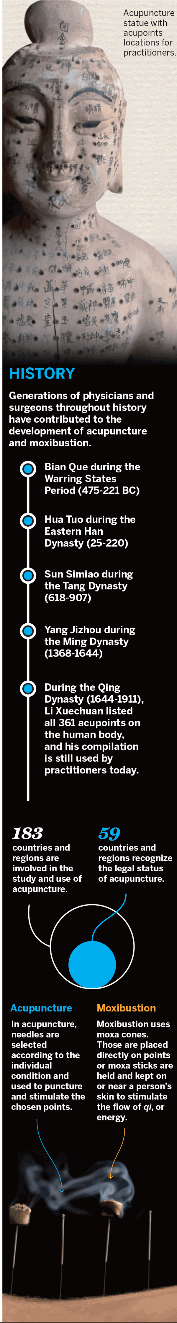 Acupuncture and moxibustion, treatments of traditional Chinese medicine, have won increasing recognition throughout the world since they were inscribed on the Representative List of Intangible Cultural Heritage of Humanity by UNESCO in 2010. [Photo by He Dongping/Zhu Jun/For China Daily]
