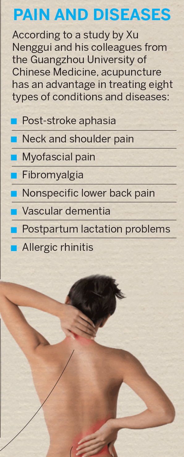 In clinical practice guides from more than 40 countries and regions, including the US, the United Kingdom and Japan, acupuncture is one of the recommended therapies for certain diseases and for conditions like pain and depression, according to the report.