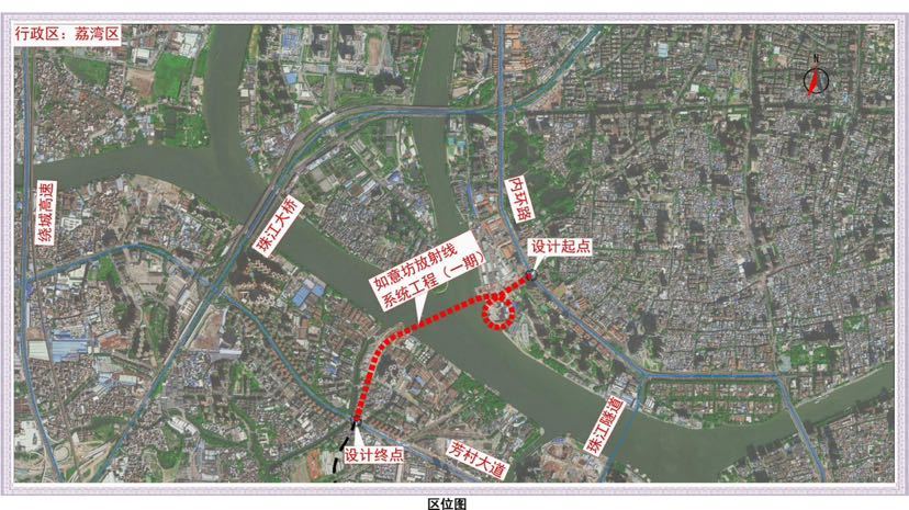 如意坊放射线系统工程(一期)由市交通运输局主管,市中心区交通项目管理中心负责组织实施,中铁隧道局集团有限公司负责建设。项目位于广州市荔湾区,是内环7条放射线之一,东起内环路如意坊立交,向西南下穿珠江后与芳村大道相连,是增强广州市老城区与佛山城区及西部周边城市联系的重要通道。项目全长约2.4km。隧道工程主线全长1511m,其中岸上段893m,沉管段618m,双向六车道;按城市快速路设计,设计时速除黄沙端环形范围内为40km/h外,其余为50km/h。