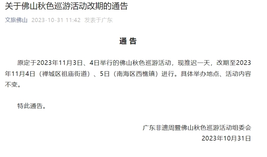 10月31日,记者从佛山市文化广电旅游体育局获悉,该局在微信公众号上发布《关于佛山秋色巡游活动改期的通告》。