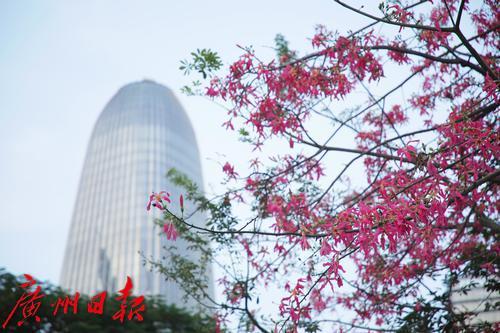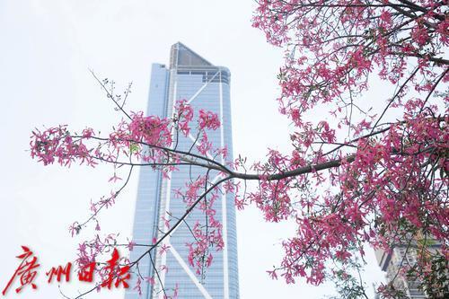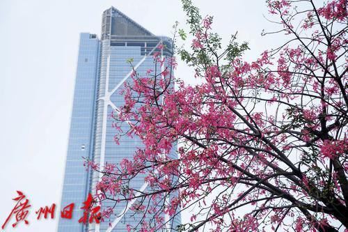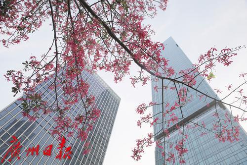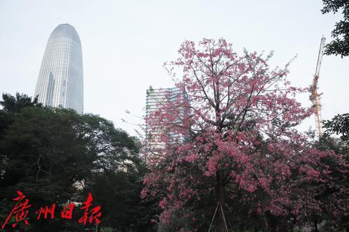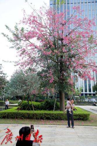 在新港东路磨碟沙地铁口附近的口袋公园,一棵高大的异木棉绽放出粉色的花瓣,在周围高楼的衬托下显得特别娇艳,在公园玩耍的市民带着孩子在花下拍照留影。