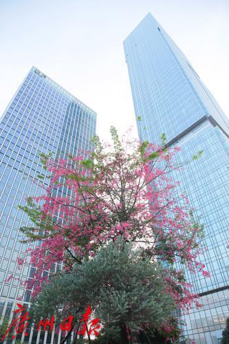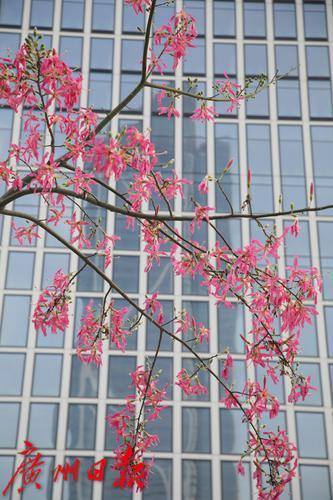 ▲▼异木棉在高楼下绽放出粉色的花瓣。