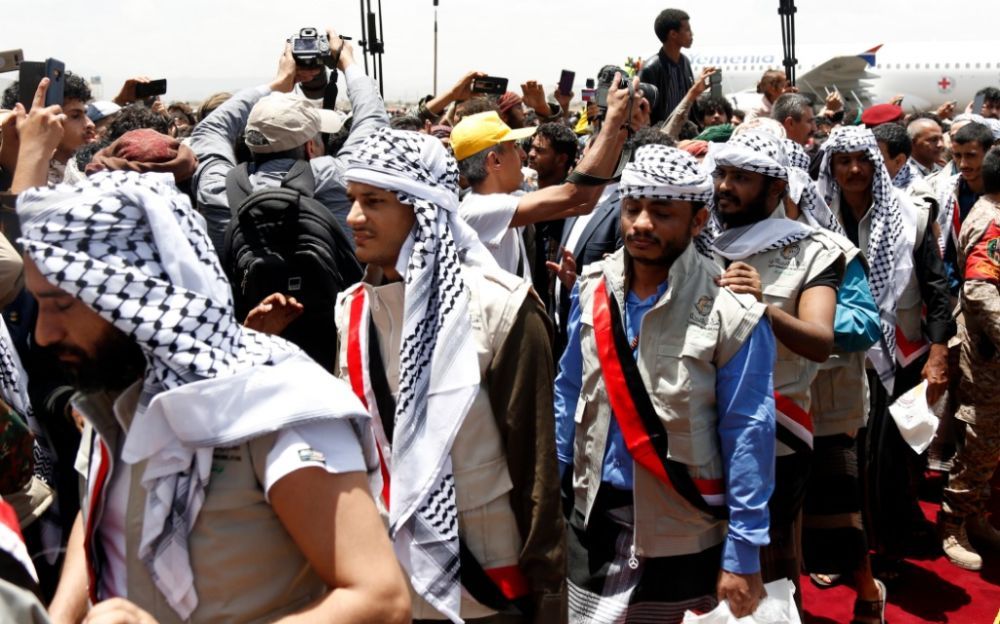 4月14日,在也门萨那机场,人们迎接获释的胡塞武装成员战俘。新华社发(穆罕默德·穆罕默德摄)