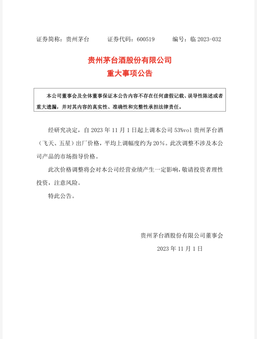 10月31日深夜,贵州茅台发布“重大事项公告”。公告称,经研究决定,自2023年11月1日起上调公司53%vol贵州茅台酒(飞天、五星)出厂价格,平均上调幅度约为20%。此次调整不涉及本公司产品的市场指导价格。