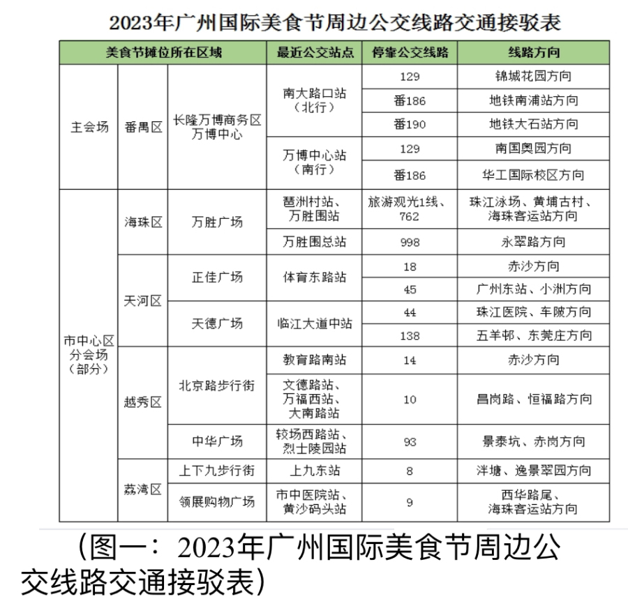 据悉,美食摊位布设阶段和美食节举办期间,万博中心部分路段将实施临时交通管控和车辆禁停,时间为2023年10月26日23:00至11月16日00:00(共22天)。由于周边人流、车流量大,停车位紧张,建议乘搭公共交通工具,以绿色出行的方式前往美食节主会场。其中,南大路口站(北行)、万博中心站(南行)是最接近主会场的公交车站,市民可乘搭一汽巴士三分公司129、番186、番190等公交线路直达。