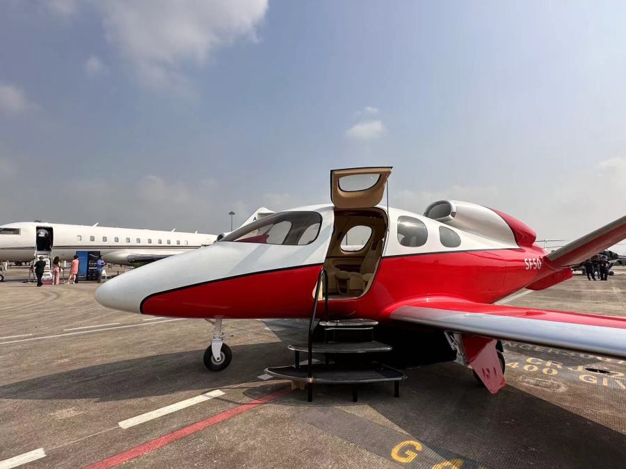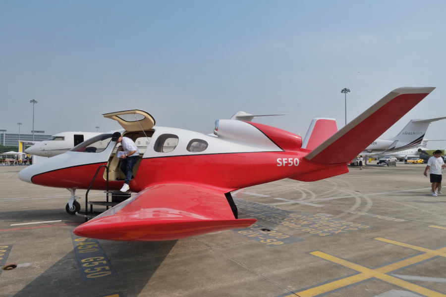 航展现场,中航通用飞机有限责任公司带来了全球第一款针对私人飞行“愿景”的SF50喷气机模型。据中航通飞工作人员介绍,SF50是一款7座单发喷气式轻型公务机,最大航程可达2300公里,主要用于公务飞行和私人飞行。该飞机是一款单发机,相对双发的公务机,其运营成本更低。