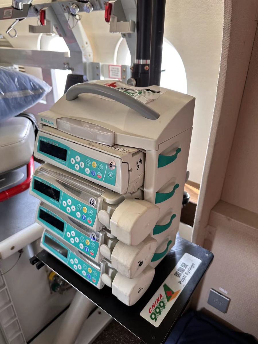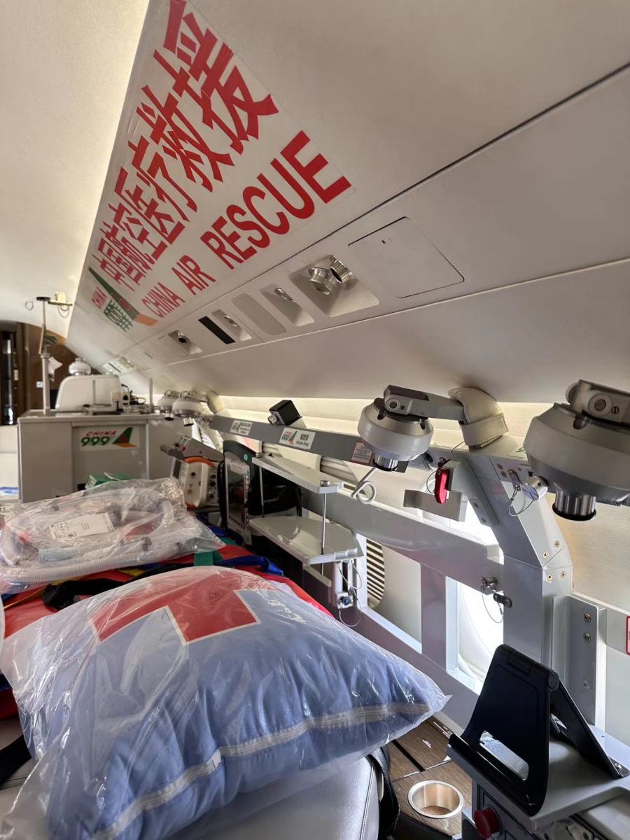 飞机上配备了监护仪/除颤一体机,用于病人转运时监测心跳、血压变化;真空担架便于在转运过程中塑形固定患者;呼吸机、供氧系统、检验操作台、医疗观片灯等设施一应俱全,可在飞机上救治各类患者。不久前,该飞机从乌鲁木齐转运了一名危重患者前往广州,该患者在广州医院救治后目前已脱离危险、转入普通病房。