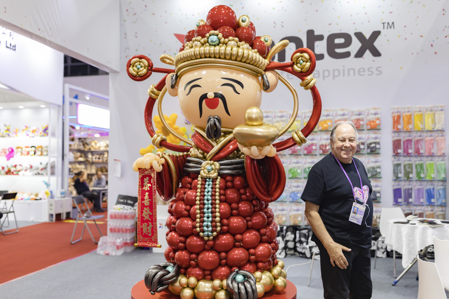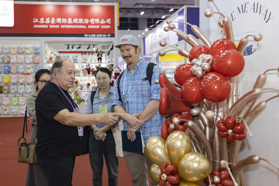 值得关注的是,通过广交会,这家企业不仅开拓到了客户,更收获了珍贵的合作伙伴。在他们展位现场,与“气球艺术作品”同样引人关注的还有一位银发爷爷——不同于其他人,这位拥有外商面孔的老人家挂着的不是采购商证,而是参展商证。原来,这位已经年逾八十的老人家名叫费尔南多,已经从事气球生意超过50年,跟广交会也有近30年情缘。