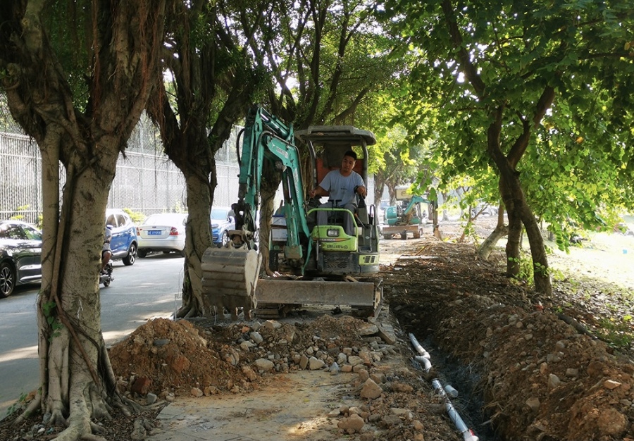 11月2日,记者从市桥河南岸的南堤西路往西骑行,从市桥三桥桥底穿过后,发现从岐头水闸旁边开始,有施工队在开挖路边的绿化带或人行道,有的地段在开挖土坑、铺设地下管线,有的地段在预埋路灯杆的地脚螺栓、浇筑混凝土,施工路段延续到历奇山庄附近,长达数公里。从历奇山庄继续往沙湾古镇方向走,在接近龙湾大桥的河堤路,也在实施路灯安装工程。