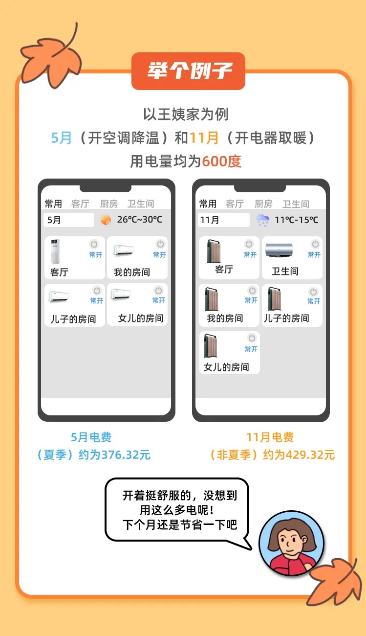 以居民王姨为例,假设王姨家5月和11月的用电量均为600度,根据公式可以计算到:5月电费为376.32元,11月电费为429.32元。由此可见,在同样的用电量下,因夏季与非夏季电量档位标准不同,费用会不一样。