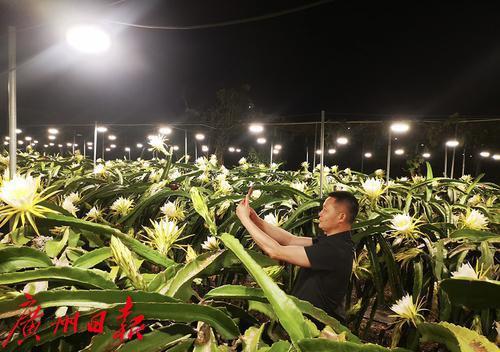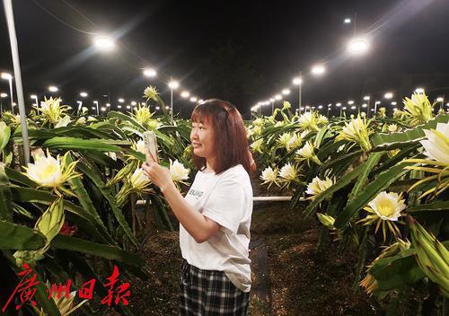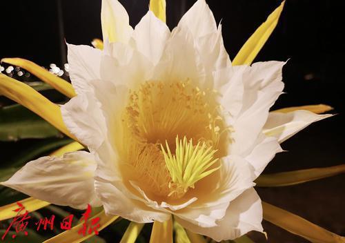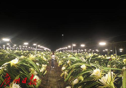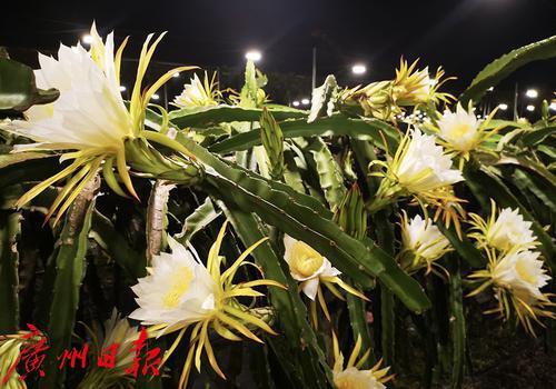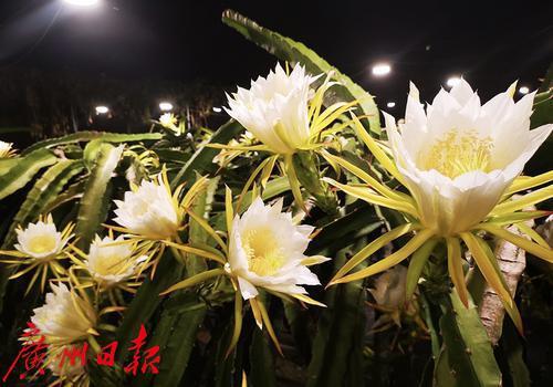 近日,番禺区大刀沙村尚果生态采摘园的火龙果花迎来盛放期,在植物补光灯的照耀下,大朵大朵的火龙果花争相绽放,洁白的花瓣尽情舒展,淡黄色花蕊散发出阵阵清香,吸引过路的市民驻足观赏。
