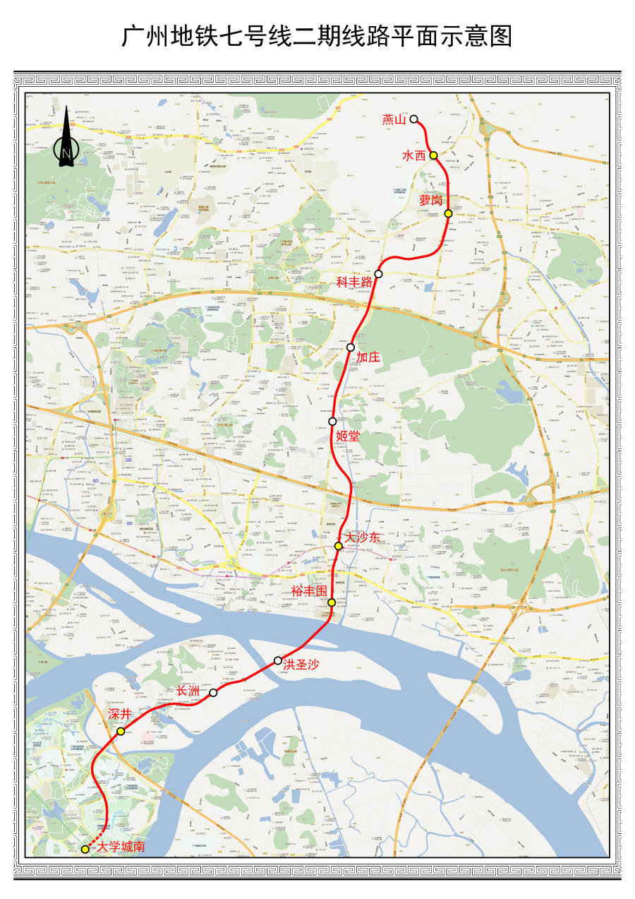 地铁七号线二期线路起于大学城南站,向北延伸至燕山站,全长约21.9公里,均为地下线,途经番禺区、黄埔区,设有换乘站8座(将衔接4条既有线、4条规划线)。
