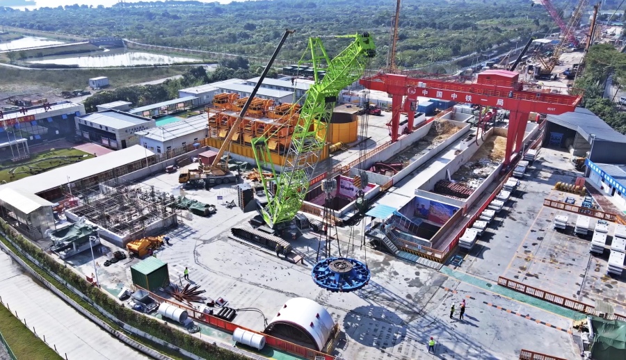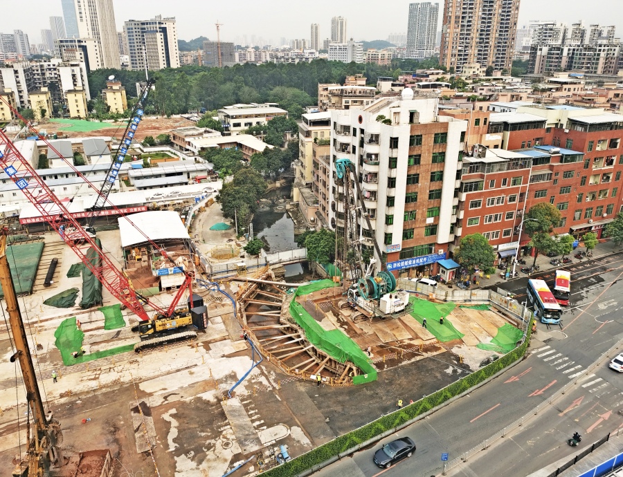 地铁七号线二期首次在国内使用了集泥水、土压、TBM模式于一身的三模式盾构机,定向连续取芯钻具及水平定向钻探等工艺。其中,大沙东站是地铁七号线二期全线唯一的地下四层车站,与既有五号线大沙东站换乘,车站地处黄埔区中心老城区,最大基坑开挖深度约39米,这也是全线最深的基坑工程,由于周边建(构)筑物密集,地质条件差,砂层厚、岩面高,淤泥质砂层及中粗砂层厚达15米,硬岩厚度达20米,为基坑开挖施工带来巨大挑战。为提升施工效率,地铁建设者们多次组织调研,开展科研攻关,优化施工组织方案,最终根据不同阶段投入“鹰钩机”“啄木鸟”等不同的破岩设备,配选出效率最高的开挖设备。