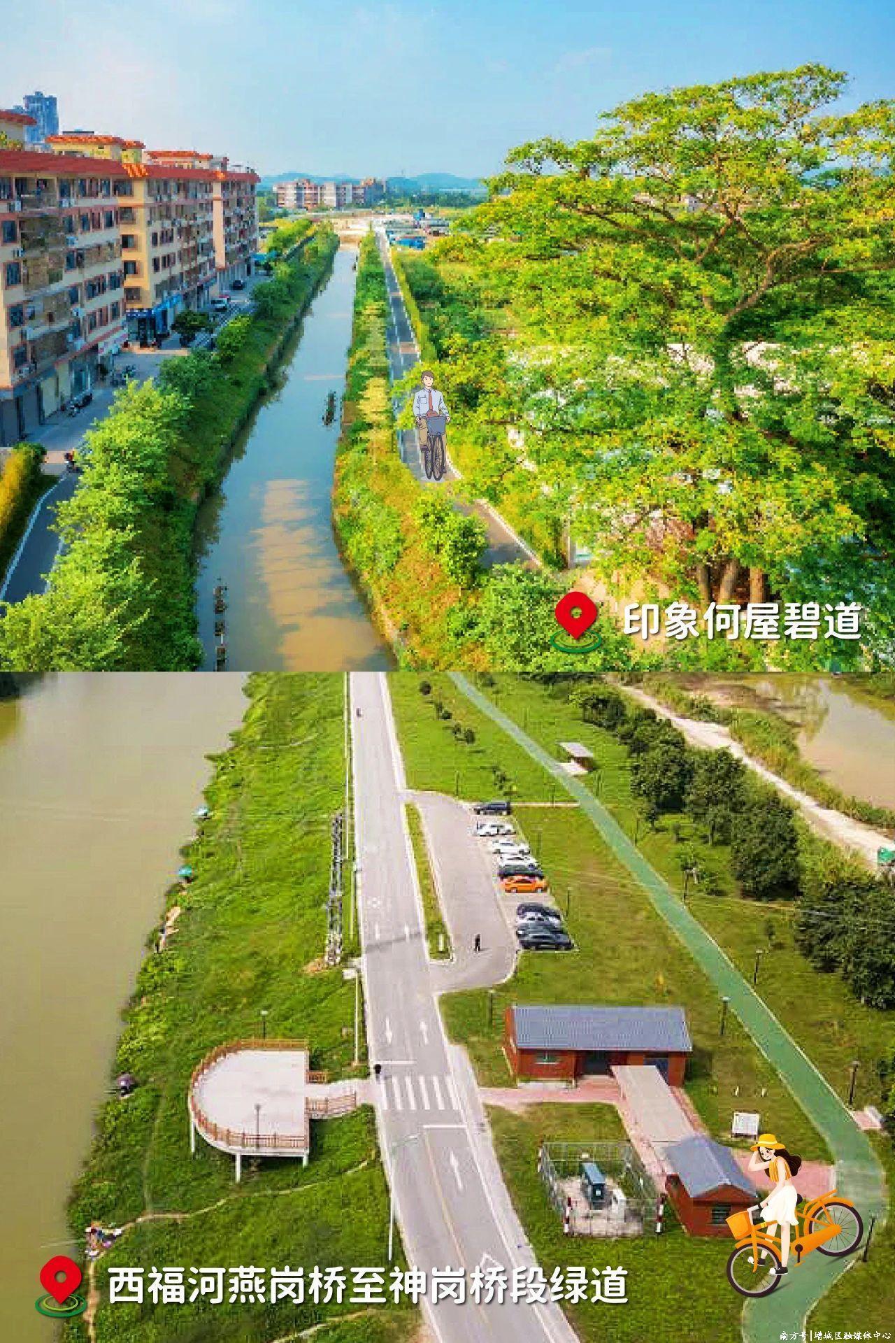 西福河燕岗桥至神岗桥段绿道:河清岸绿、环境优美,吸引周边市民前来,骑行在碧道上还可以欣赏到西福河的美景。