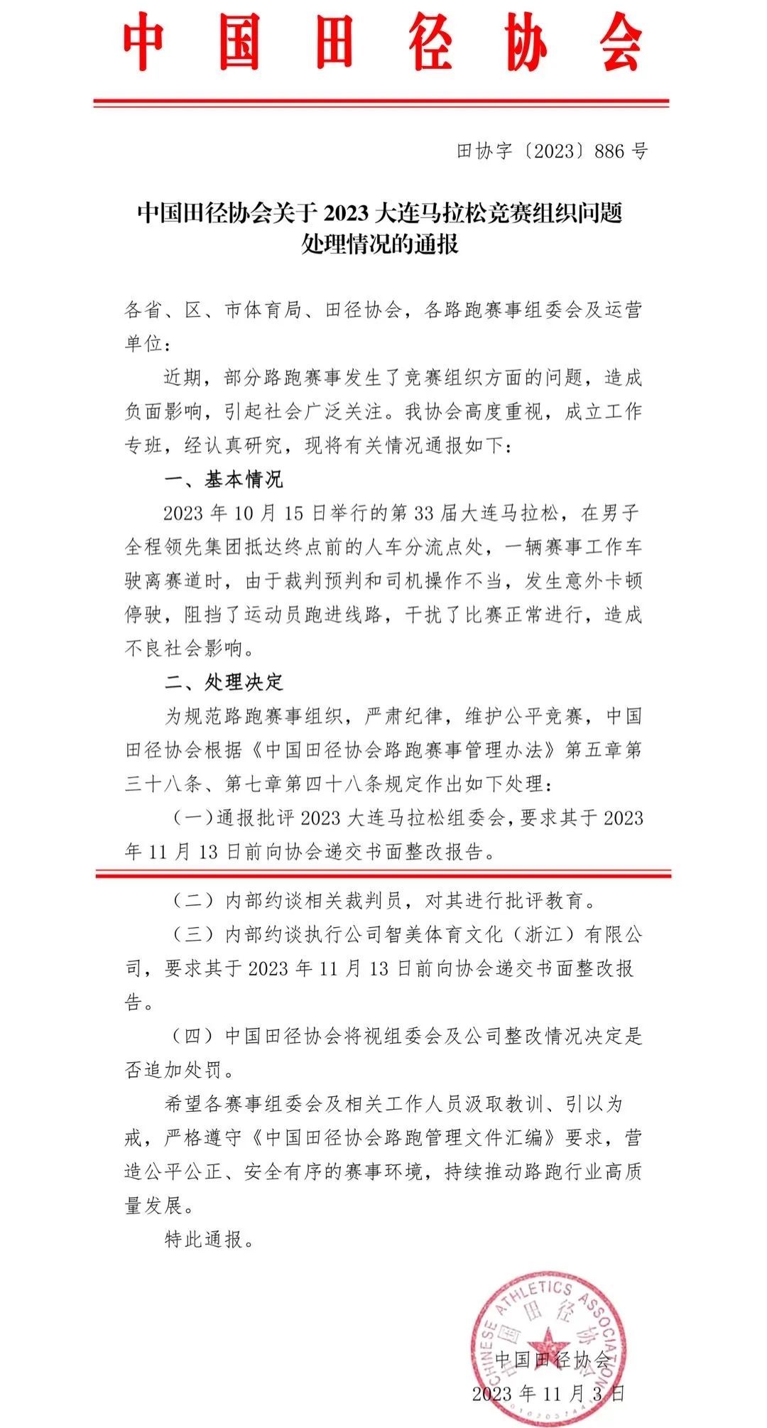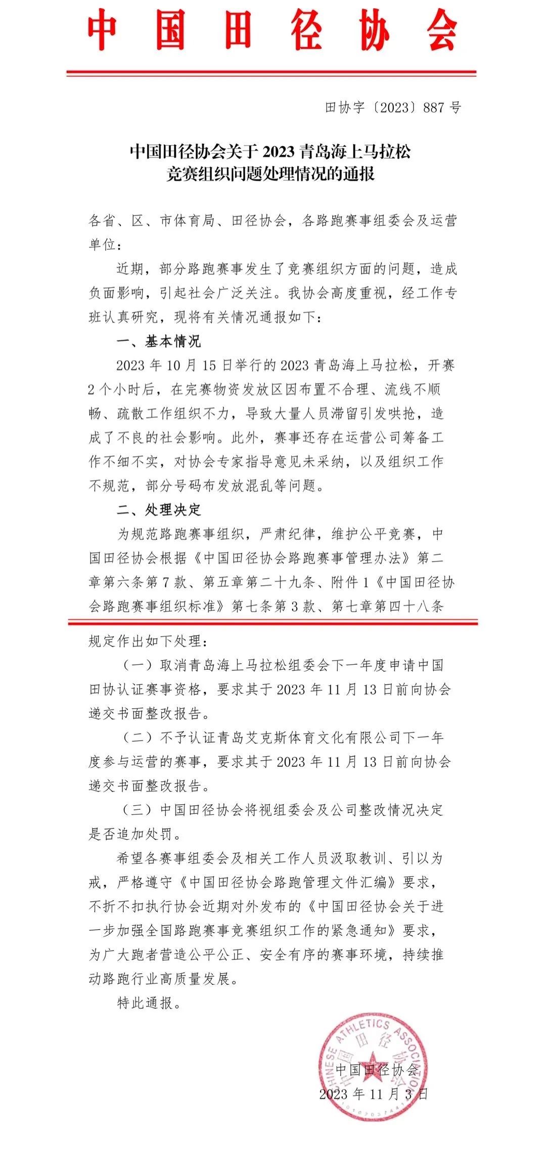“中国马拉松平台”官微消息,近日,部分路跑赛事出现了一些竞赛组织问题,引发社会广泛关注,造成了不良的社会影响。中国田径协会高度重视、全面调查,依据事实和路跑赛事管理规定,从加强竞赛组织,压实各方主体责任,提示行业风险隐患的角度,对相关单位和人员进行了相应处理。现将处理情况通报如下: