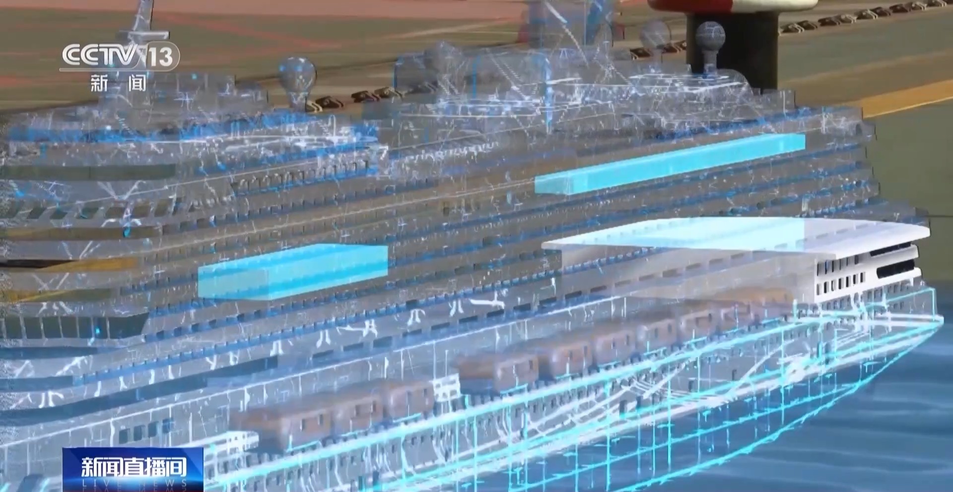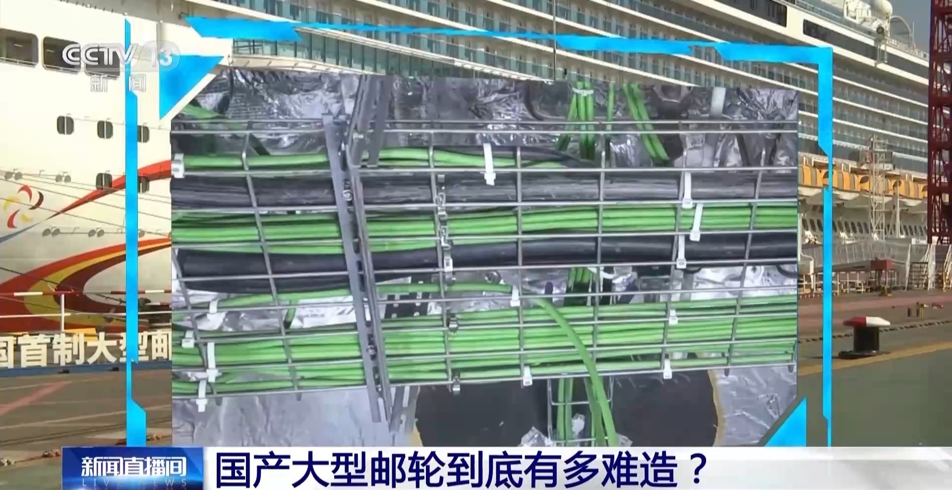 总台央视记者陶嘉树:大型邮轮体量庞大,工程复杂,全船安装的零件数量超过2500万个,是“复兴号”高铁的13倍。同时,由于邮轮体型庞大,在建造过程中,超大的船坞也是必备条件,它的面积相当于7个标准足球场。