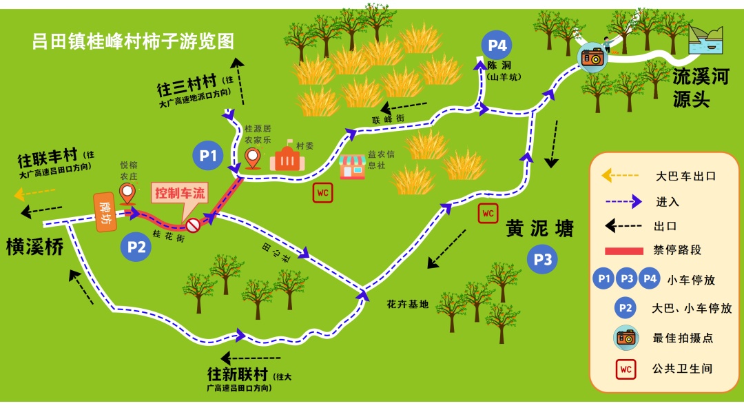 大型旅游客车(大巴)禁止在村内通行,需统一在2号停车场停放车辆和接送游客。大巴从2号停车场驶出时,须从桂花街(左转)→联丰村→吕田墟镇→大广高速吕田出口方向行驶,禁止进入桂花街(右转)至大广高速地派出口方向行驶。