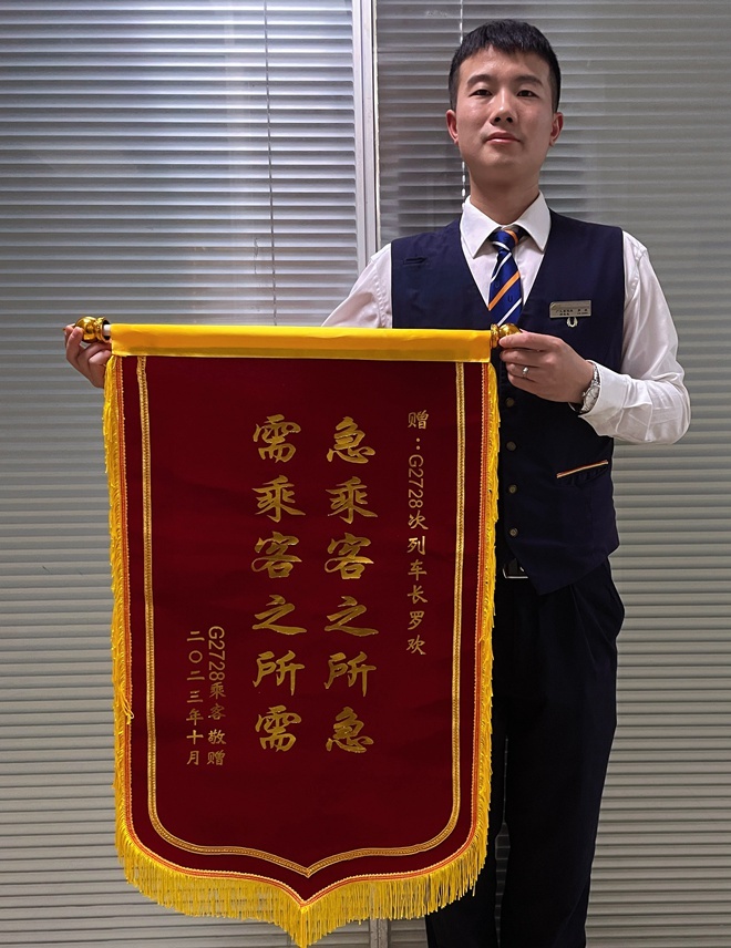 近日,江西南昌旅客杨先生将一面绣有“急乘客之所急 需乘客之所需”的锦旗,寄到了广铁集团广九客运段,对该段列车长罗欢的热心之举表示由衷感谢。