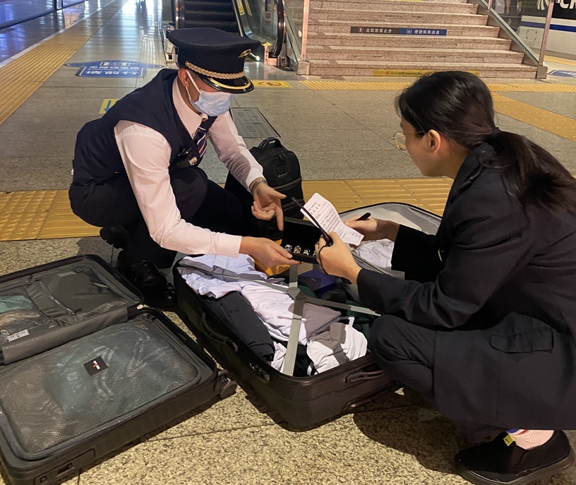 罗欢心想旅客肯定心急如焚,赶紧根据杨先生的提示,与列车工作人员快速查找,最终在2-3号车厢连接处找到了杨先生的行李箱和背包,此刻距罗车长接到工单信息还不超过3分钟。