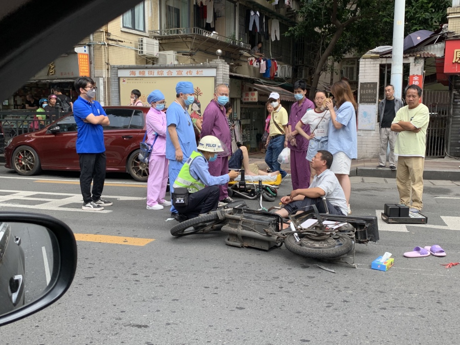 电动自行车一名伤员坐在地上,表情痛苦。