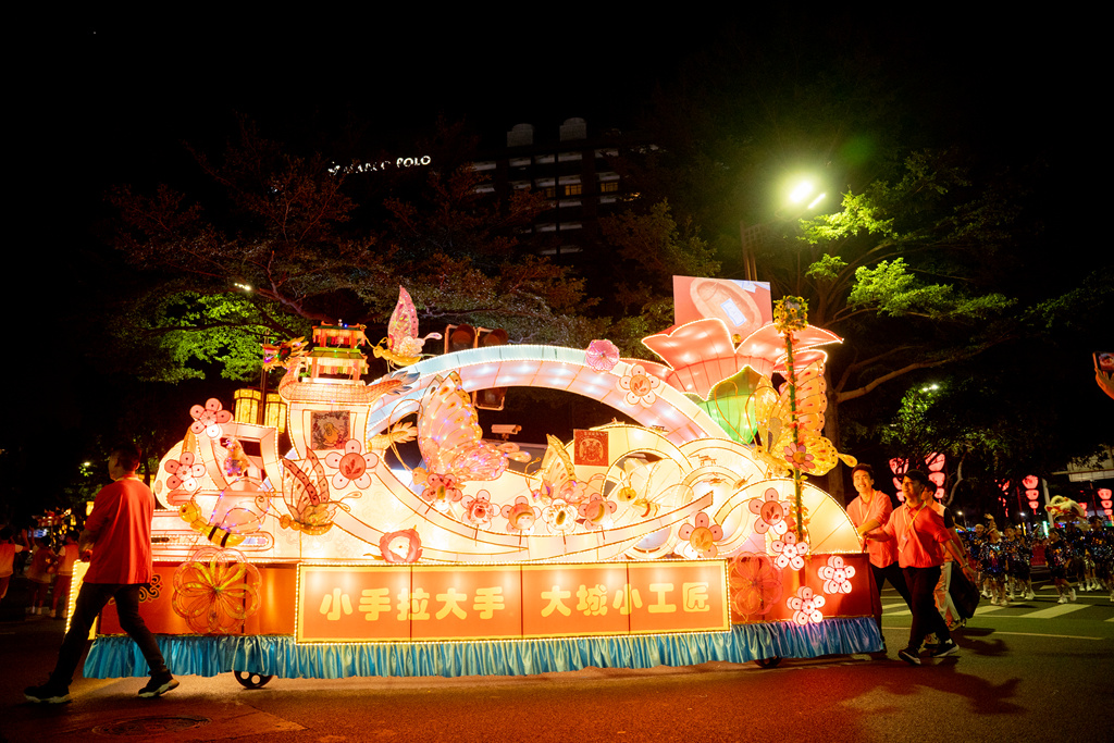排在彩车队伍第二辆出场的,是一辆五彩缤纷、灵动夺目的花车,它由顺德杏坛麦村小学龙舟说唱的孩子们高举佛山市建设小学孩子们设计制作的手持龙舟彩灯引领前进,沿途和观众进行互动。这是由佛山市博物馆、佛山市非物质遗产保护中心设计、名为“非遗百花园”的创意花车。花车前面,是一个彩灯扎制的巨大玩偶,这是佛山市非遗保护中心今年特别推出的“2023小手拉大手 大城小工匠”活动的主IP形象,名叫“小锦鲤”。彩车的主体,是由省级传承人陈棣桢及其弟子——彩灯扎作市级传承人杨小燕、唐洁容、林燕华、梁凤英等亲手扎制的彩灯花车作品。“非遗百花园”里,彩蝶飞飞、翠鸟翩翩、蜜蜂嘤嘤、鲜花盈盈……花车尾部,一朵巨大的红棉花正在绽放,木棉花蕊上是两块大屏幕,播放着这辆花车的主题内容——“2023小手拉大手 大城小工匠”非遗传承活动全部的影像资料。