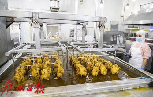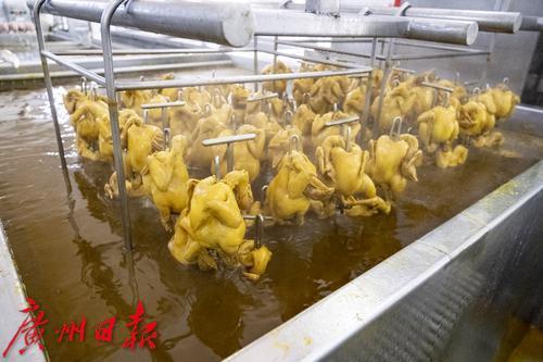 记者走进江丰卓味预制菜加工厂的生产车间内,一台起吊机正把一池4笼共280只白云黄鸡从卤煮池中吊起,随后移入冷却池“过冷河”。只见盐焗黄鸡色泽金黄,空气中弥漫着诱人浓香。“我们精选148天龄的江村黄鸡,将其放入客家秘制卤汁中卤煮,经过‘三浸三沥’让鸡均匀受热,鲜美鸡汁也被锁在肉内。”该工厂厂长江智杰介绍。