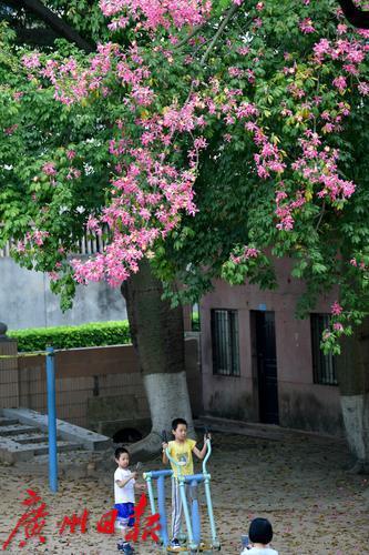 小朋友在美丽异木棉下运动。