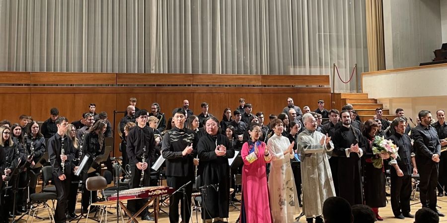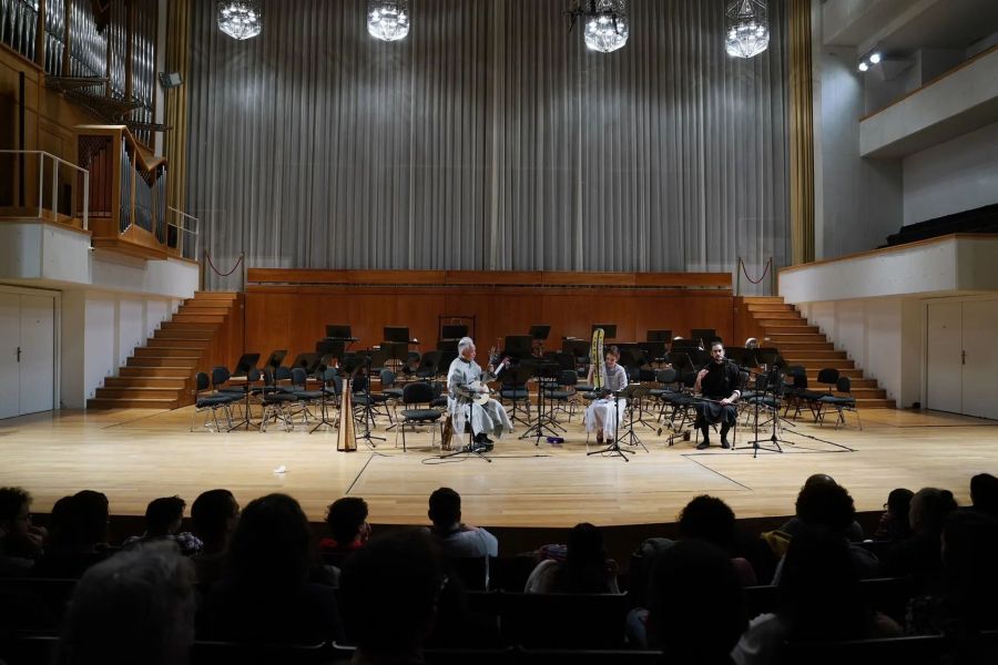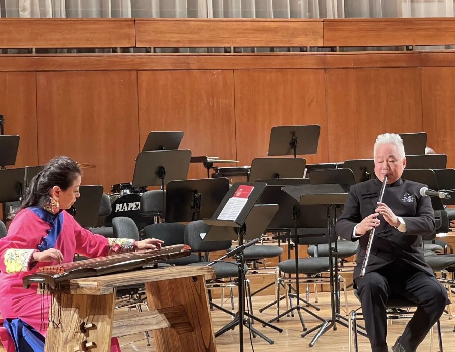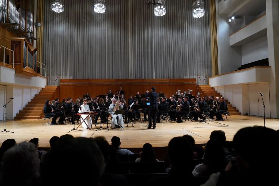 当晚,可容纳700多人的法雅音乐厅大厅座无虚席。音乐家们纷纷上演精彩节目:王成懿用一曲扬琴独奏《绣荷包》,接住了管乐团宏大叙事的开篇《格拉纳达》余韵,方锦龙则以《千年响声》的厚重底蕴,用古琴托起另一重悠远意境。《酒狂》的恣意,带出张雨《平沙落雁》的悠然自得,迎来张维娜和方锦龙《梅花三弄》的高洁,又隐入张雨尺八《虚铃》的淡泊之中……