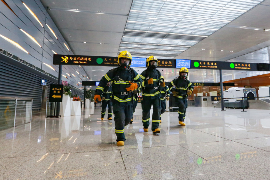 粤澳联合演练科目则将灾情设定为港珠澳大桥旅检大楼三楼粤方出境大厅商务区有一商铺发生火灾,多名群众来不及逃生,被困火场。旅检大楼相关部门工作人员在报警的同时,立即启动应急预案,组织群众进行疏散,并通过应急广播系统播报灾情,单位内部微型消防站队员快速集结开展初期火灾扑救。