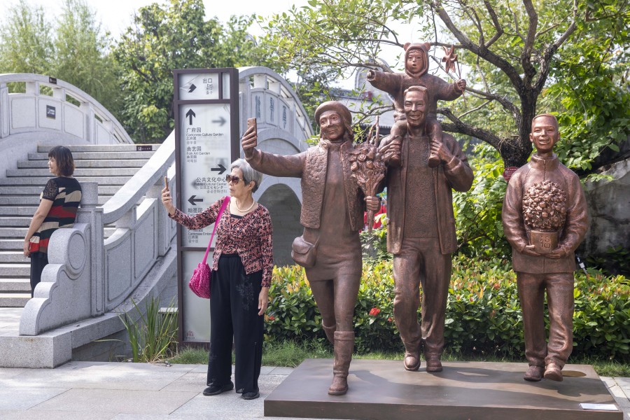 不少市民朋友到广州市文化馆参与本次“花会周”惠民活动的同时,打卡馆内多处户外雕塑。