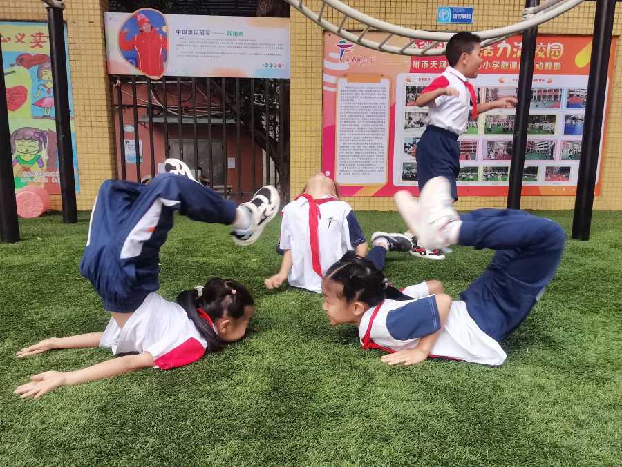 课间10分钟,天河区天府路小学的同学们在活动身体。