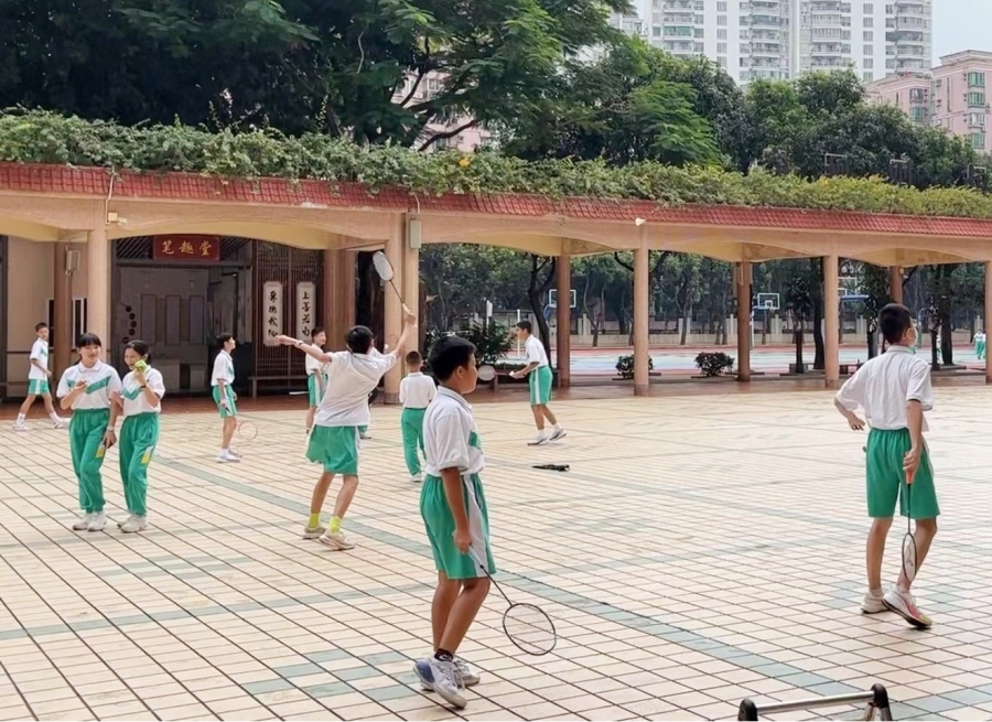 广州市南武实验学校的同学们在课间10分钟打羽毛球。