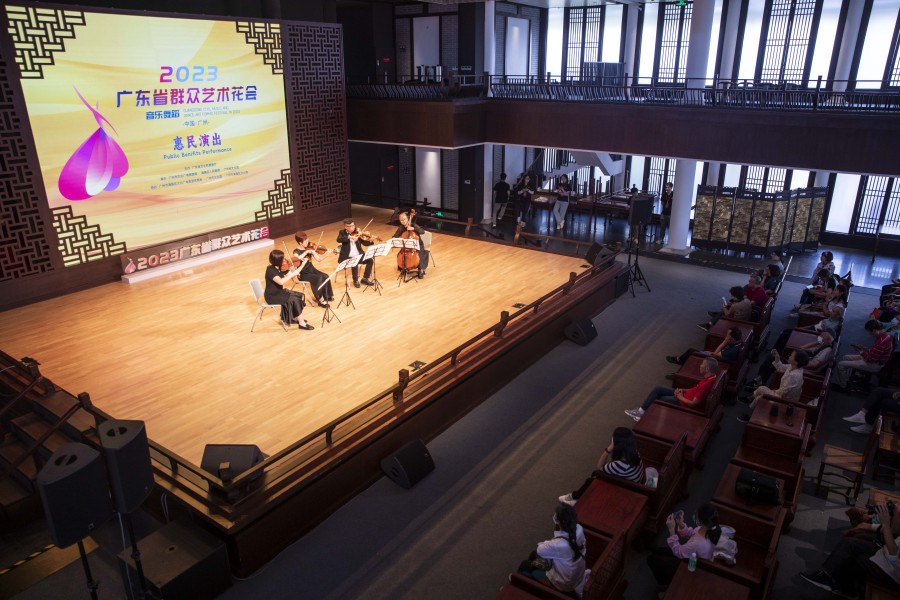 在“花会周”期间,多支决赛参赛团队、广州市优秀群文团队在广州市文化馆内给市民朋友送上约20场惠民演出,这些演出不拘于室内剧场,曲艺园、千人广场也能欣赏到艺术与文化馆独特风光相结合的美好。