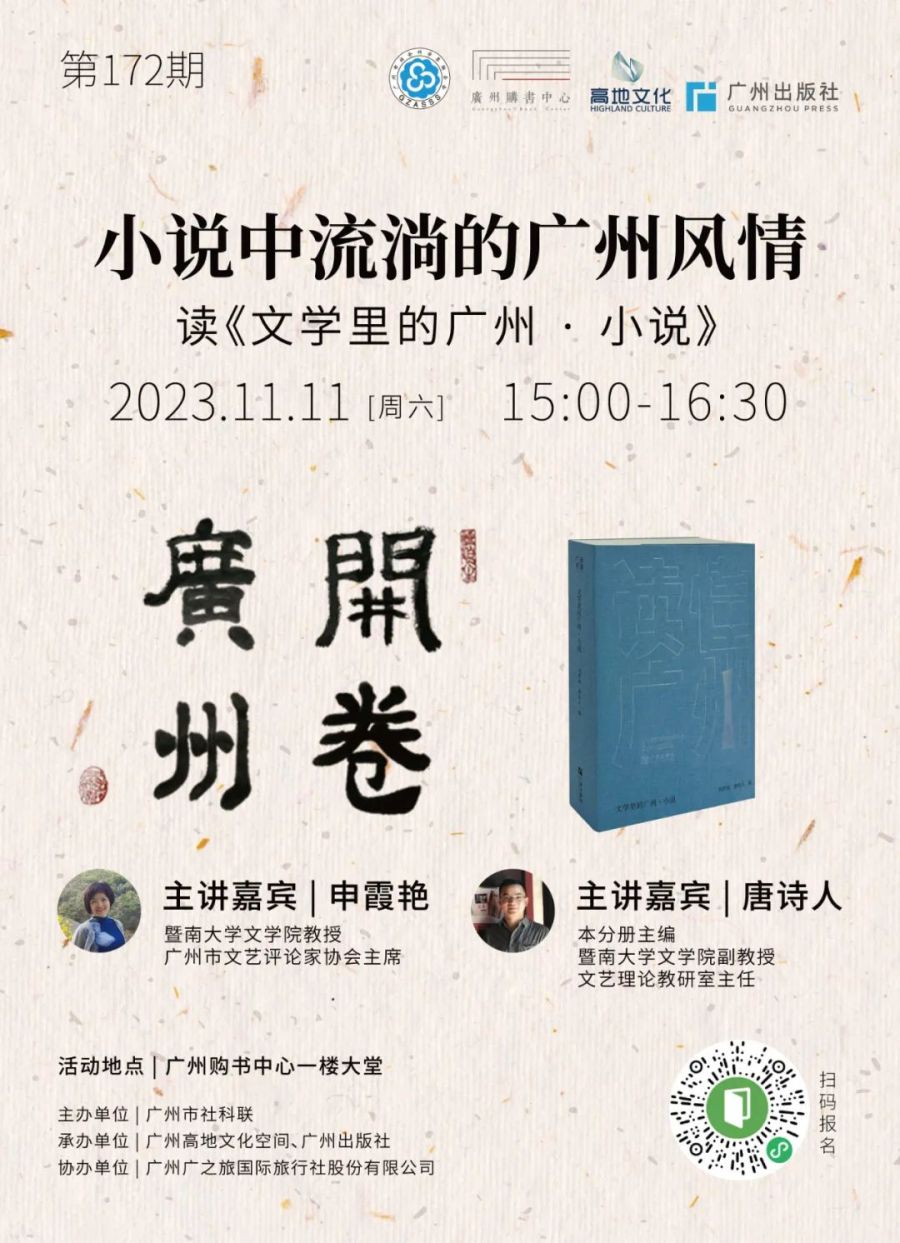 本期讲座,嘉宾申霞艳与唐诗人将解析岭南地区小说中的文学元素,对收录进《文学里的广州·小说》中的经典小说进行赏析,展现粤语方言和岭南风物在文本中的文学效果,带领读者领略岭南文化内涵。