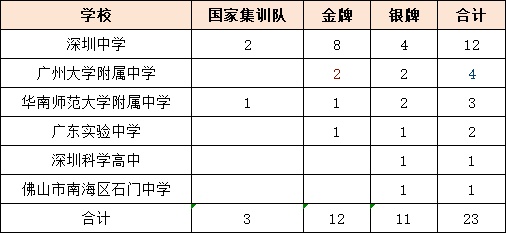 本届赛事中,广东共有23名学生获奖。其中12名学生获得金牌,11名学生获得银牌。获金牌人数最多的学校是深圳中学,有8名学生获得金牌;其次为广大附中,2名学生获金牌,华附、省实各有1名学生获金牌。