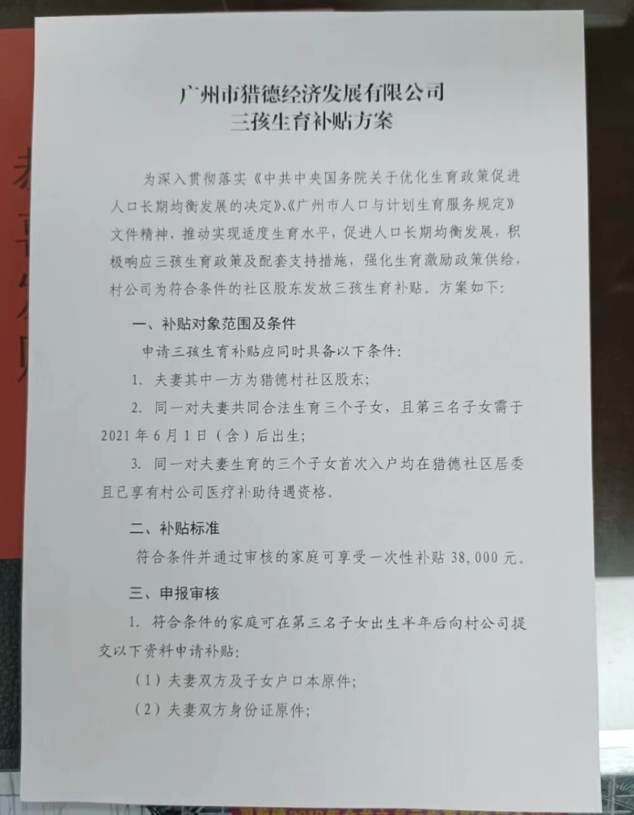 近日,网上流传一则《广州市猎德经济发展有限公司三孩生育补贴方案》(以下简称“方案”)。根据方案,猎德村符合条件并通过审核的家庭可享受一次性补贴 38000元。根据方案,申请三孩生育补贴应同时具备以下条件,包括:夫妻其中一方为猎德村社区股东;同一对夫妻共同合法生育三个子女,且第三名子女需于2021年6月1日(含)后出生;同一对夫妻生育的三个子女首次入户均在猎德社区居委且已享有村公司医疗补助待遇资格。