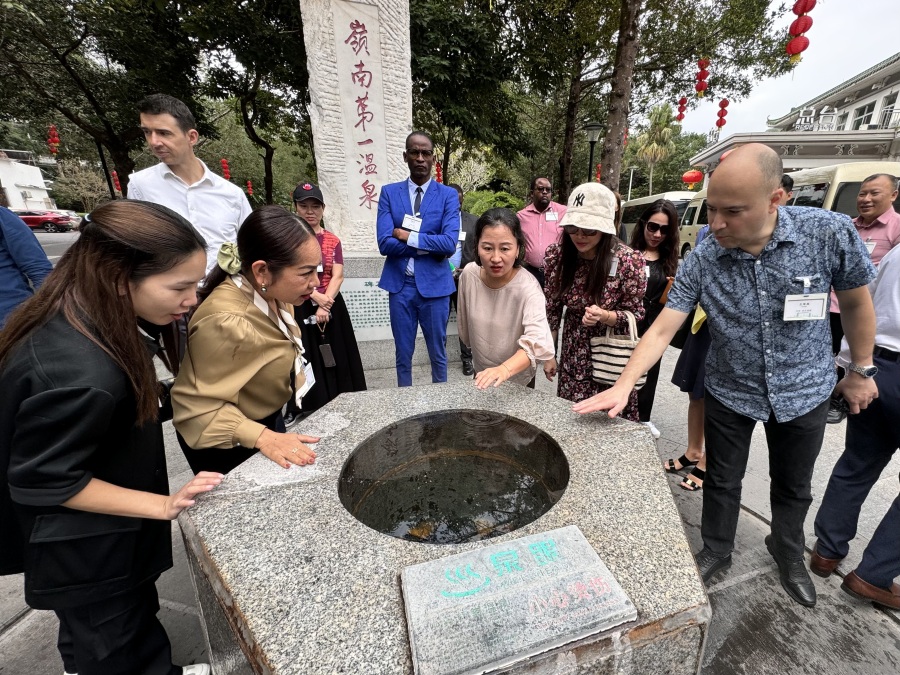 从化温泉是世界珍稀的含氡苏打温泉,温泉水从流溪河底涌出,泉温高达71℃。广东温泉宾馆内有一处温泉水泉眼,温泉水清澈晶莹、无色无味,含有钠、钾、钙、镁、氡等多种矿物质和微量元素,素有“岭南第一温泉”之美誉。不少领馆官员及家属表示,从化山清水秀,水资源丰富,温泉清澈晶莹,给其留下了深刻印象。