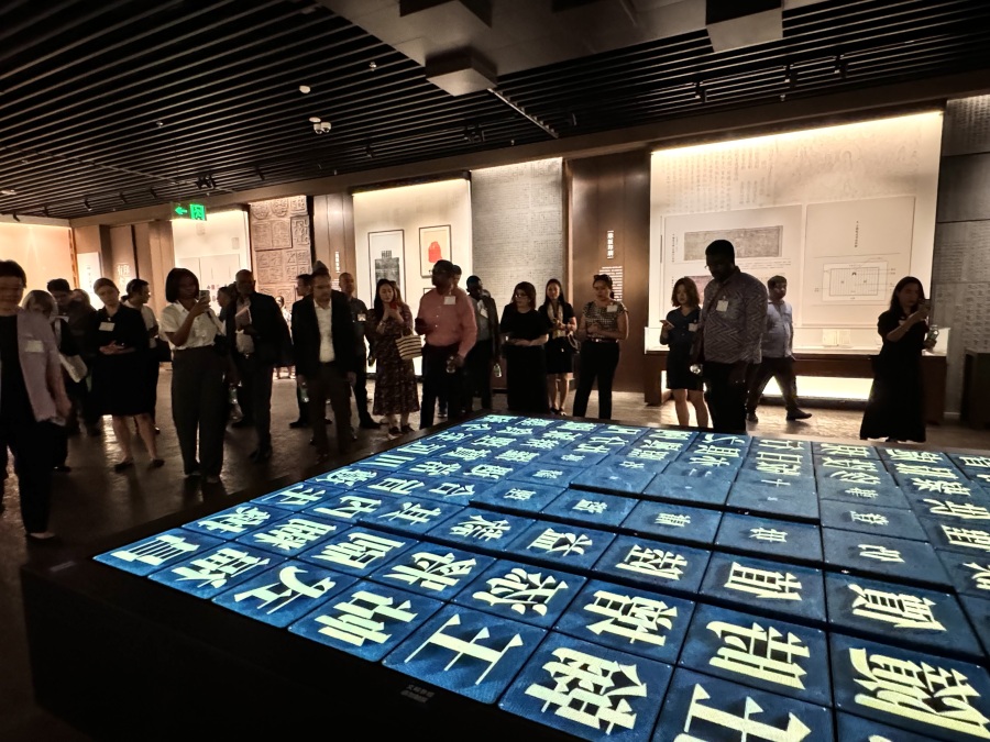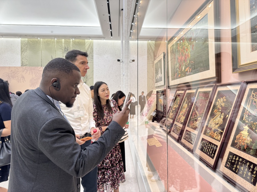 当天上午,领团一行先后参观了国家版本馆广州分馆(文沁阁)和广东温泉宾馆。在文沁阁,通过观看裸眼3D华夏册府,参观中华版本发展概览及海上丝绸之路专题版本展,领团一行感受了厚重的中华优秀传统文化,纷纷点赞文沁阁设计理念及文化藏品。广绣、石雕、端砚、牙雕……韩国驻广州总领事姜相旭对馆内陈列的精巧工艺品赞不绝口,并不时用中文向身边的工作人员询问技法。