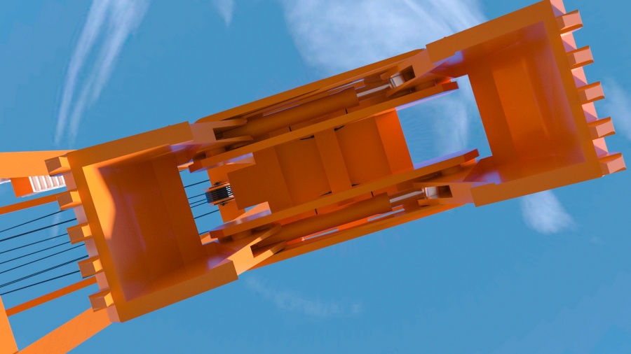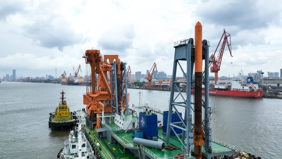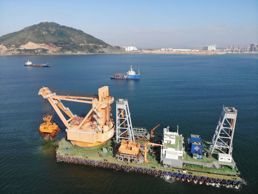 只见400吨重的巨型抓斗在操作员的控制下轻盈而迅速地沉入海底。