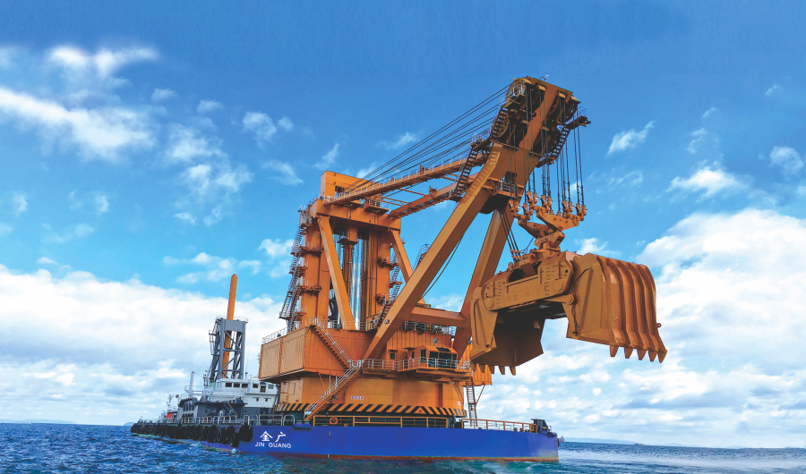 重型挖泥船在疏浚业内扮演着重要的角色。它能够高效地清理港口、航道和水道中的淤泥和沉积物,保持水域的通航能力。据了解,“金广”是中交广州航道局有限公司(以下简称“中交广航局”)旗下的超大型抓斗式挖泥船,船长100米,船宽36米,高45米,配备两套液压抓斗,最大挖深30米,重机最大吊重690吨。其中斗容量200立方米的抓斗,使它赢得了“世界第一抓”的美誉。