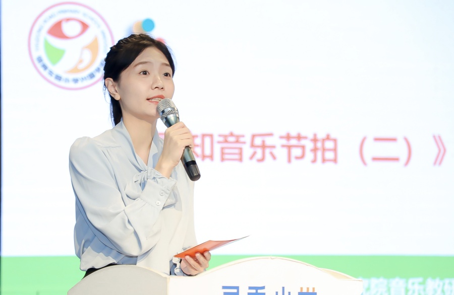 本次活动推介了体育东路小学兴国学校、灵秀小学两个团队围绕文化理解的核心素养,打磨民歌单元的课例研讨成果。活动中,体育东路小学兴国学校音乐团队的刘佳琦老师,率先上台作课例推介——《感知音乐节拍(二)》。据悉,该课例经过团队多次研讨打磨,在艺术新课标视域下,探索音乐要素与舞蹈律动,促进艺术融合,提高学生艺术表现和理解能力。
