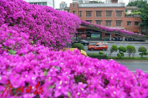 广州又进入了赏看簕杜鹃的最佳时节,时下广州各高架和天桥上的簕杜鹃均悉数绽放,紫红色的花朵把这些桥路打造成了一条条的“花路”。越秀区正南路与东风西路交界的天桥上的簕杜鹃也进入了盛花期,天桥两侧覆盖满了紫红色的花,繁茂的花朵不时吸引着过往行人驻足拍照。