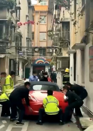 2022年4月,广东江门一住宅楼4楼天台铁皮屋起火。在消防车通往起火住宅楼的路上,一辆小车违规停放在消防车通道,让本该直接开往起火点楼下的消防车不能通行。时间紧迫,交警、消防等多部门联合徒手挪动汽车,再利用移车器将车挪走。