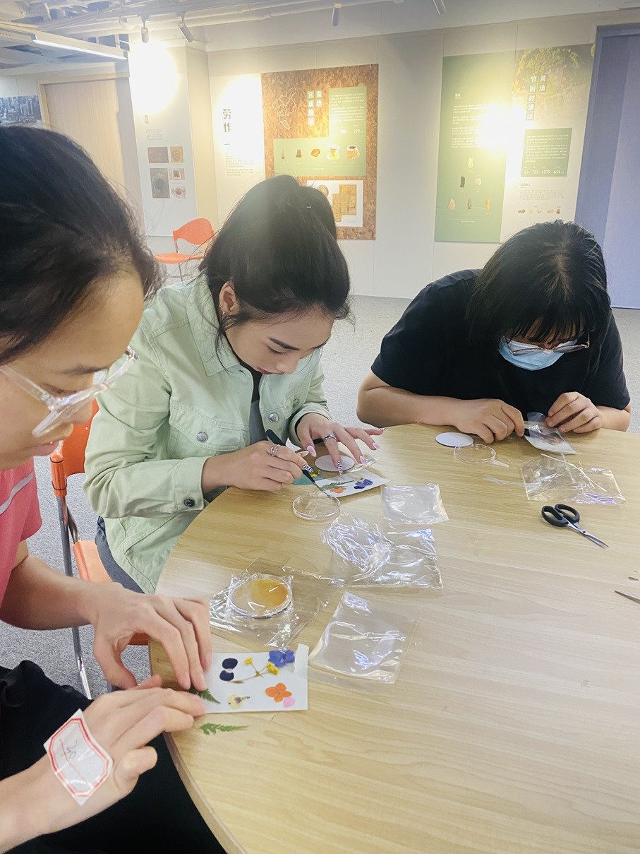 Olivia(香港青年学生,绿色衣服)在广州青宫夜校上押花课