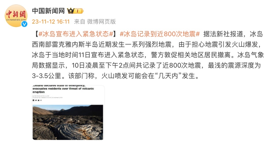 中国新闻网援引法新社报道,由于担心地震引发火山爆发,冰岛于当地时间11月11日宣布进入紧急状态,警方敦促相关地区居民撤离。